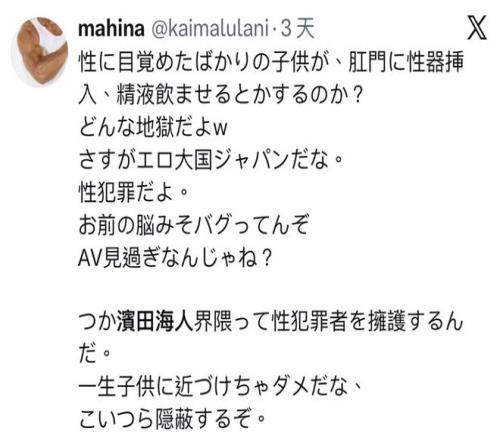此外,滨田海人身边的人,竟然都为他这个强奸犯辩护开脱,真不是人!你们这群人平日还是人模狗样的,但最好离小朋友远点!”