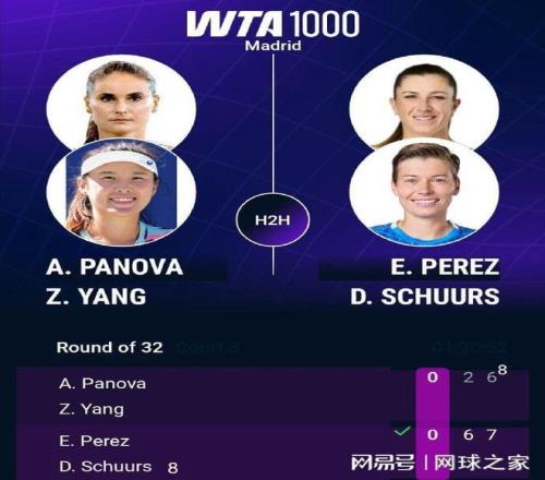 双打赛场:在首轮一场较量中,中俄组合杨钊煊/帕诺娃以2-6 6-7(8)不敌8号种子佩雷兹/舒尔斯,遭遇一轮游。